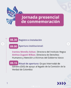 Te invitamos a participar en las actividades de conmemoración organizadas por Hegoa (EHU) y el Grupo Internodal de Género de apoyo al legado de la Comisión de la Verdad (GIG) – Red de apoyo al Legado de la Comisión de la Verdad en Europa (REL), con el respaldo de la Dirección de Derechos Humanos y Atención a Víctimas del Gobierno Vasco.