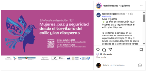 🎗️ Conmemoramos los 25 años de la Resolución 1325 del Consejo de Seguridad de la ONU, reconociendo el papel de las mujeres migradas y exiliadas en la construcción de paz y en la transformación de los conflictos.