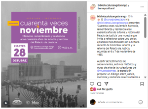 👉🏼 El @consejodeestado y la @bibliotecaluisangelarango presentan ‘Cuarenta veces noviembre. Memoria, remembranza y resiliencia a los cuarenta años de la toma y retoma del Palacio de Justicia’ una muestra que invita a reflexionar sobre uno de los episodios más dolorosos de la historia reciente de Colombia: la toma y la retoma del Palacio de Justicia, ocurridas el 6 y 7 de noviembre de 1985.
