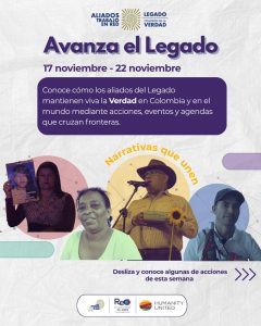📍 Del 17 al 22 de noviembre, aliados y aliadas de la Comisión de la Verdad siguen moviendo el Legado desde distintos territorios del país y el mundo. 🌍