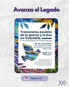 • Lanzamiento de “Transiciones posibles de la guerra y la paz en Colombia a una década del Acuerdo de Paz”.