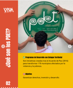 🔎 ¿ Qué son los PDET? Son programas creados tras el Acuerdo de Paz de 2016 para garantizar derechos, inversión y desarrollo en zonas vulnerables.