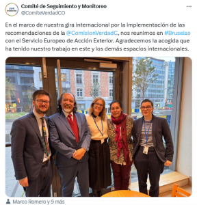 En el marco de nuestra gira internacional por la implementación de las recomendaciones de la @ComisionVerdadC , nos reunimos en #Bruselas con el Servicio Europeo de Acción Exterior. Agradecemos la acogida que ha tenido nuestro trabajo en este y los demás espacios internacionales.