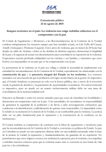 La persistencia de la violencia en el país nos obliga a señalar la necesidad de implementar con celeridad las recomendaciones de la Comisión de la Verdad, especialmente las relacionadas con la construcción de paz y la presencia integral del Estado en los territorios. Los recientes atentados son una muestra de que la población civil sigue siendo blanco de la guerra.