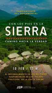 #ESTRENO | 📅 Viernes 10 de febrero. La Jurisdicción Especial para la Paz estrenó “Con los pies en la Sierra. Camino hacia la verdad”. Es el tercer episodio de la serie documental de la Jurisdicción Especial para la Paz que reúne los momentos más importantes de las audiencias de reconocimiento realizadas durante el año 2022 en los casos de secuestros y de “falsos positivos”.