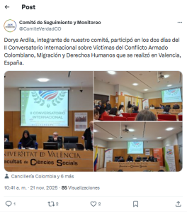 Dorys Ardila, integrante de nuestro comité, participó en los dos días del II Conversatorio Internacional sobre Víctimas del Conflicto Armado Colombiano, Migración y Derechos Humanos que se realizó en Valencia, España.