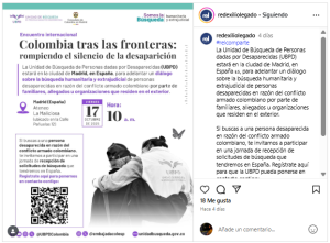 La Unidad de Búsqueda de Personas dadas por Desaparecidas (UBPD) estará en la ciudad de Madrid, en España 🇪🇸, para adelantar un diálogo sobre la búsqueda humanitaria y extrajudicial de personas desaparecidas en razón del conflicto armado colombiano por parte de familiares, allegados u organizaciones que residen en el exterior.