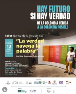 En el marco de la exposición “Hay Futuro Si Hay Verdad” queremos invitarles a participar en el taller “La paz de toma la palabra” del Banco de la República, que tiene por objetivo enseñar a navegar la Biblioteca Digital del Banco de la República, reconociendo los contenidos de la transmedia de la Comisión de la Verdad, y propiciar una reflexión sobre el valor de la memoria y la verdad en la construcción de paz.