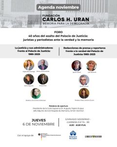 El 6 de noviembre las 11am nos vemos en el Centro Cultural Gabriel García Márquez – conversatorio “los otros desaparecidos en el palacio de justicia” y a las 5:30pm nos vemos en el Gimnasio Moderno para el foro: “40 años del asalto del Palacio de Justicia: juristas y periodistas ante la verdad y la memoria”