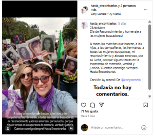A todas las mamitas que buscan, a las hijas, a las compañeras, las hermanas, a todas las mujeres buscadoras, mi reconocimiento y abrazo amoroso, por su lucha, porque siguen tercas en la esperanza de memoria, verdad y justicia. Cuentan conmigo siempre! Hasta Encontrarlos