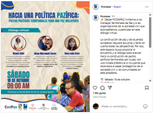 📣 Desde FICONPAZ invitamos a los Consejos Territoriales de Paz y a las organizaciones de la sociedad civil que acompañamos, a participar en este diálogo virtual.
