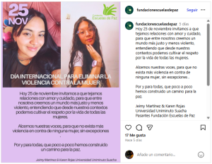Hoy 25 de noviembre invitamos a que tejamos relaciones con amor y cuidado, para que entre nosotrxs creemos un mundo más justo y menos violento, entendiendo que desde nuestrxs contextos podemxs cultivar el respeto por la vida de todas las mujeres.