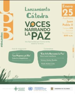 Con este lanzamiento inicia oficialmente el proyecto de extensión “Encuentros para la comprensión del conflicto armado en el territorio y reescritura de nuevas narrativas hacia la convivencia y la paz” financiado por el Fondo Multidonante de las Naciones Unidas para el sostenimiento de la Paz, cuyo objetivo es la apropiación del Legado de la Comisión de la Verdad. La cátedra “Voces narrando la paz” se realizará en distintos territorios del Nororiente y Magdalena Medio con niños, niñas, jóvenes y adolescentes y mujeres y con el apoyo de organizaciones socias como la Corporación Compromiso (Bucaramanga), Colectivo Magdalenas (Barrancabermeja), Mesa de Víctimas de Suratá y el Colegio Francisco San Juan del Corregimiento de Turbay en Suratá.