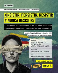 🕯Amnistía Internacional invita al lanzamiento del informe ¿Insistir, persistir, resistir y nunca desistir? El impacto de la intervención de la Justicia Penal Militar en la impunidad por violaciones de derechos humanos en Colombia 🇨🇴. Presentado en el marco de la Mesa por la Reforma Policial.