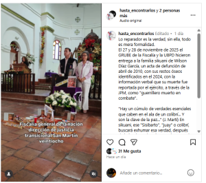 El 27 y 28 de noviembre de 2025 el GRUBE de la Fiscalía y la UBPD hicieron entrega a la familia sikuani de Wilson Díaz García, un acta de defunción de abril de 2010, con sus restos óseos identificados en el 2024, con la información verbal que su muerte fue reportada por el ejército, a través de la JPM, como “guerrillero muerto en combate”.