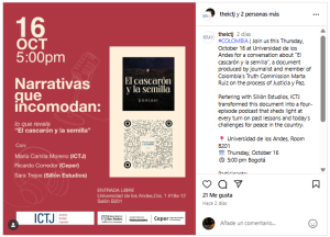#COLOMBIA | Join us this Thursday, October 16 at Universidad de los Andes for a conversation about “El cascarón y la semilla”, a document produced by journalist and member of Colombia’s Truth Commission Marta Ruiz on the process of Justicia y Paz.