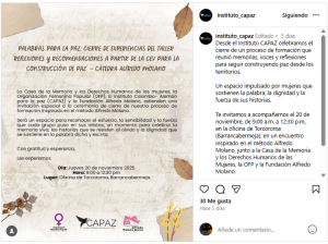 Desde el Instituto CAPAZ celebramos el cierre de un proceso de formación que reunió memorias, voces y reflexiones para seguir construyendo paz desde los territorios.