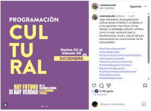 Llego Diciembre y la programación cultural desde el Martes 2 al Sábado 6 en la exposición Hay Futuro Sí Hay Verdad. La estrategia cultural y artística como un paso necesario para la transformación social y cultural del país, reconociendo las cosmovisiones de las comunidades.