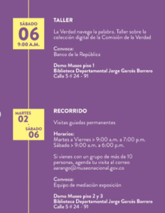 Minsterio de las Culturas, las Artes y los Saberes, Museo Nacional de Colombia, Trabajo en Red entre Aliados del Legado de la Comisión de la Verdad, Gobernación Departamental del Valle del Cauca, Biblioteca Departamental Jorge Garcés Borrero, Casa de las Memorias del Conflicto y la Reconciliación, Secretaría de Paz y Cultura Ciudadana - Alcaldía de Santiago de Cali, Cooperación Alemana.