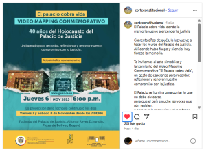 Te invitamos al acto simbólico y lanzamiento del Video Mapping Conmemorativo “El Palacio cobra vida”, un gesto de esperanza para recordar, reflexionar y renovar nuestro compromiso con la justicia.