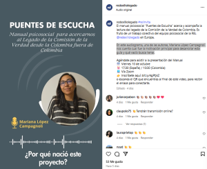 El manual psicosocial “Puentes de Escucha” acerca y acompaña la lectura del legado de la Comisión de la Verdad de Colombia. Es fruto de un trabajo colectivo del equipo psicosocial de la REL @redexiliolegado en Europa.
