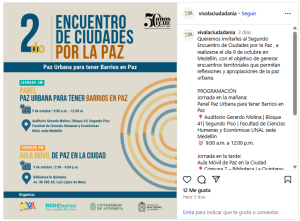 Queremos invitarles al Segundo Encuentro de Ciudades por la Paz , a realizarse el día 9 de octubre en Medellín, con el objetivo de generar encuentros territoriales que permitan reflexiones y apropiaciones de la paz urbana.