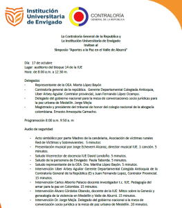 Desde nuestro compromiso con un formacion integral orientada a la sana convivencia y a la Paz en Colombia, la IUE y la Contraloria General de la República, te invita este viernes 17 de octubre al simposio nacional “Aportes a la Paz en el Valle de Aburrá” en el bloque 14 de la IUE de 8:00 a 12:30.