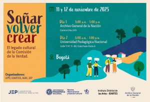 La Universidad Pedagógica Nacional – UPN, la Jurisdicción Especial para la Paz – JEP, el Archivo General de la Nación – AGN y el Instituto Distrital de las Artes – IDARTES invitan a participar del Encuentro “Soñar, volver, crear”: El legado cultural de la Comisión de la Verdad, que busca contribuir a la deliberación pública y la apropiación ciudadana del legado cultural de la Comisión de la Verdad, de la importancia de la reparación simbólica y la resignificación, mediante prácticas culturales, patrimoniales y artísticas en Colombia. https://forms.gle/x56dBkKXXBnJG3Az6