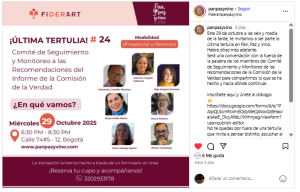 Será una conversación con la fuerza de la palabra de los miembros del Comité de Seguimiento y Monitoreo de las recomendaciones de la Comisión de la Verdad para compartirnos lo que se ha hecho y hacia dónde continuar.