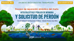 Transmisión del acto colectivo y público de memoria y solicitud de perdón en el que 107 comparecientes, quienes integraron siete unidades militares, expresan públicamente a las víctimas y a la ciudadanía su solicitud de perdón y manifiestan el reconocimiento de responsabilidad por el asesinato de 58 víctimas presentadas falsamente como bajas en combate en Meta, como acto de dignificación y arrepentimiento ante la región y el país.
